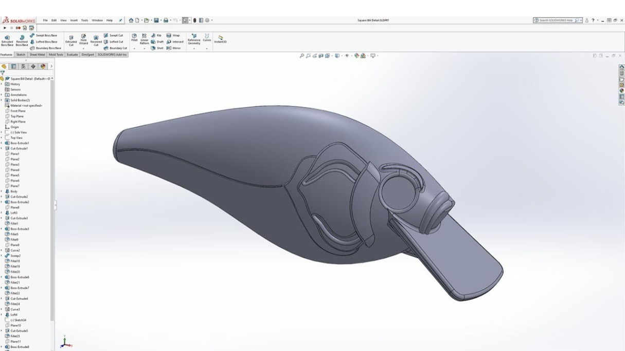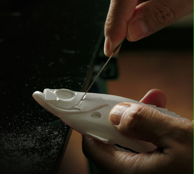The initial design aka master mold, which is carved by hand out of ABS plastic, as this adds rigid properties, provides an idea of weight, and action.